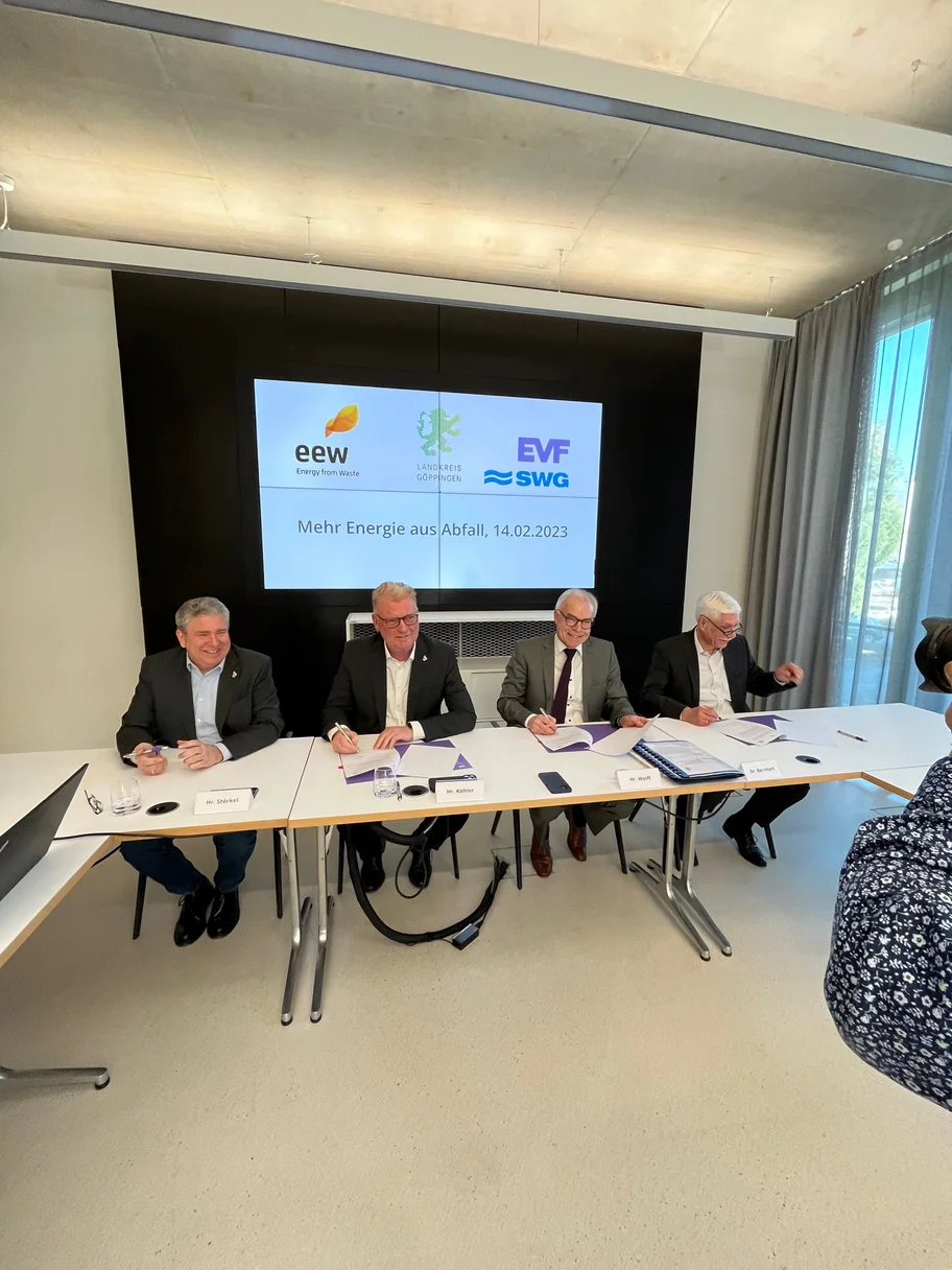 Göppingen, 14.02.2023: In der Hauptverwaltung der Energieversorgung Filstal (EVF) haben heute, Dienstag, 14.02.2023, der Geschäftsführer der EVF, Dr.-Ing. Martin Bernhart, der Landrat des Landkreises Göppingen, Edgar Wolff, und die beiden Geschäftsführer der EEW Energy from Waste Göppingen GmbH (EEW), Axel Köhler und Kai Störkel, die gemeinsame Absichtserklärung für eine weitere Wärmeauskoppelung aus dem Müllheizkraftwerk Göppingen (MHKW) unterzeichnet. Mit der dieser Presseinformation beigefügten Absichtserklärung soll – zunächst in den kommenden neun Monaten – geprüft werden, ob und unter welchen technischen, kaufmännischen und rechtlichen Rahmenbedingungen eine weitere Wärmeauskoppelung aus dem MHKW erreicht werden kann.