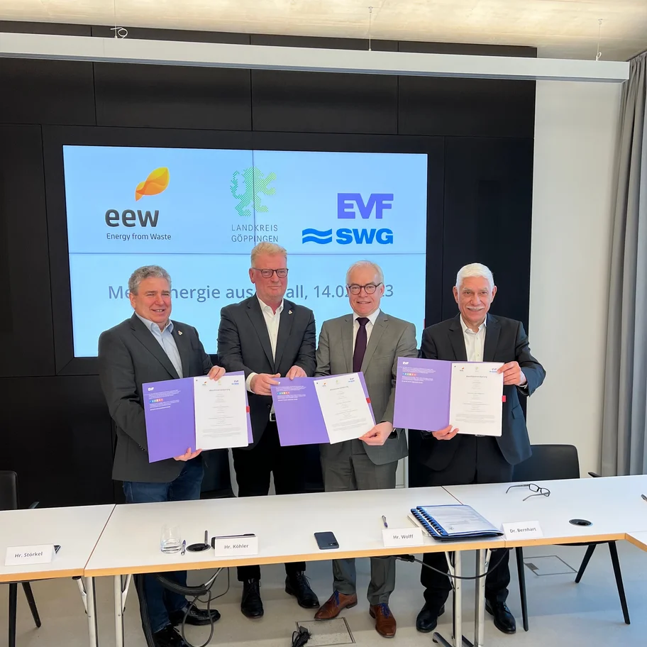 Axel Köhler und Kai Störkel erläutern: „Energie aus Abfall ist ein fester Bestandteil umweltfreundlicher Energieversorgung und die zweitwichtigste Energiequelle für die lokale Fernwärmeerzeugung. Wir freuen uns, dass dieses Potenzial in der starken Zusammenarbeit zwischen EEW, EVF und dem Landkreis Göppingen nun genutzt wird. Das ist eine klare Win-Win-Situation für Göppingen sowie den Klima- und Ressourcenschutz.“