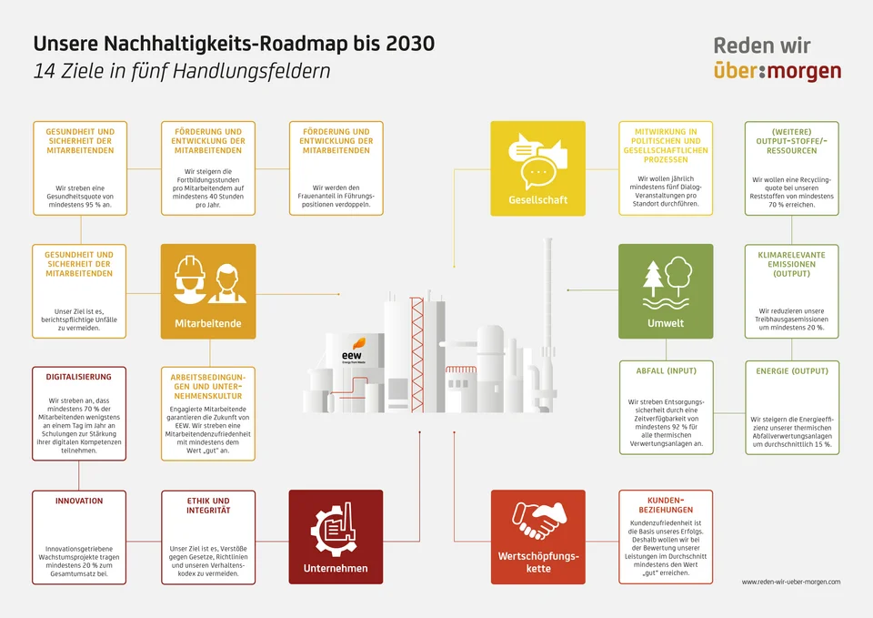 Eine nachhaltige Unternehmensführung ist sowohl in der heutigen Gesellschaft als auch in unserem Geschäftsbetrieb nicht mehr wegzudenken. In unserer 'Nachhaltigkeits-Roadmap' haben wir uns deshalb als EEW-Gruppe 14 ambitionierte Ziele in fünf Handlungsfeldern gesetzt, die wir bis 2030 erreichen wollen.