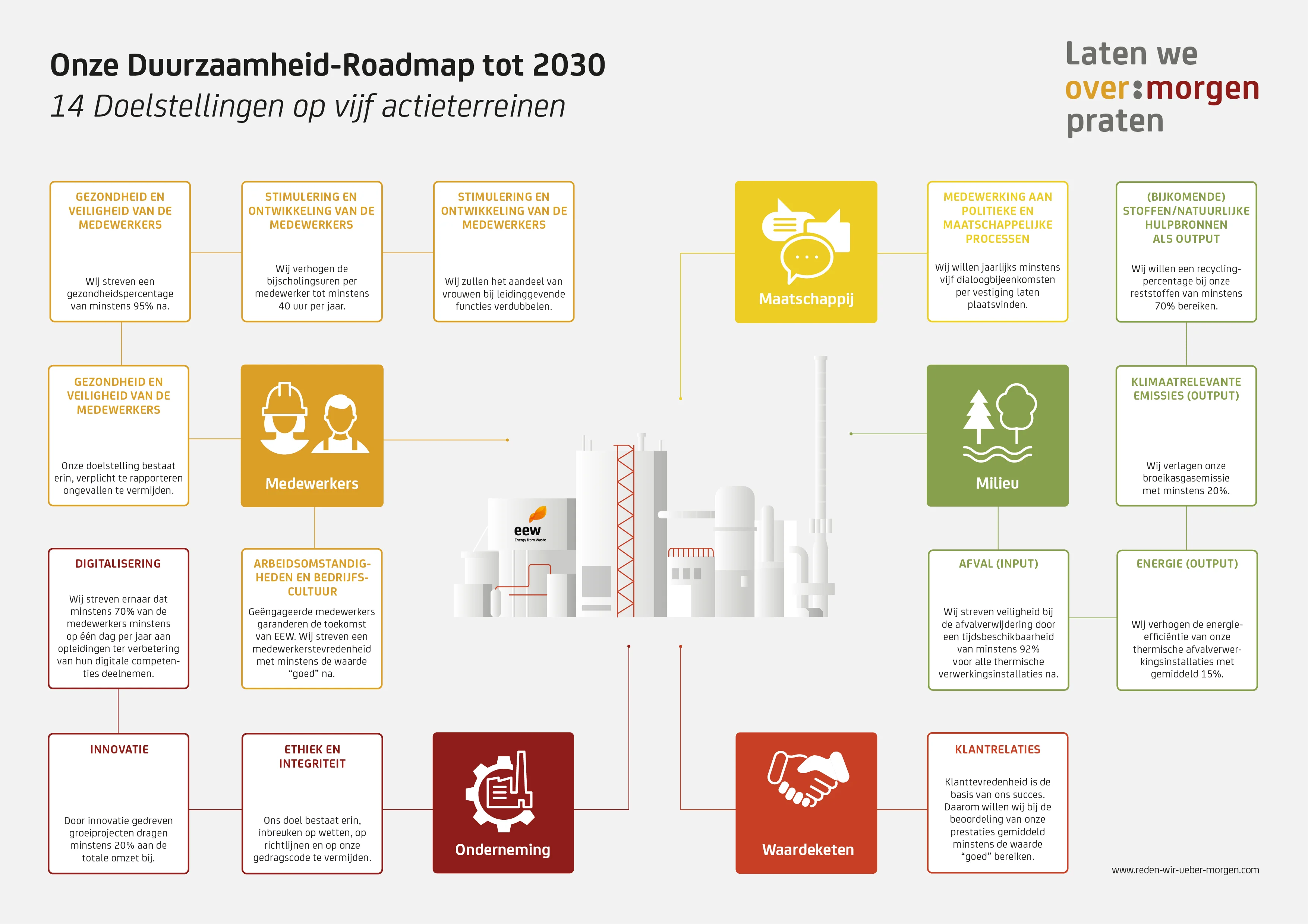 Duurzaam ondernemerschap is onmisbaar geworden in de huidige maatschappij en in onze bedrijfsvoering. In onze 'Duurzaamheid-Roadmap' hebben we ons als EEW Groep daarom 14 ambitieuze doelen gesteld op vijf actiegebieden die we tegen 2030 willen bereiken.